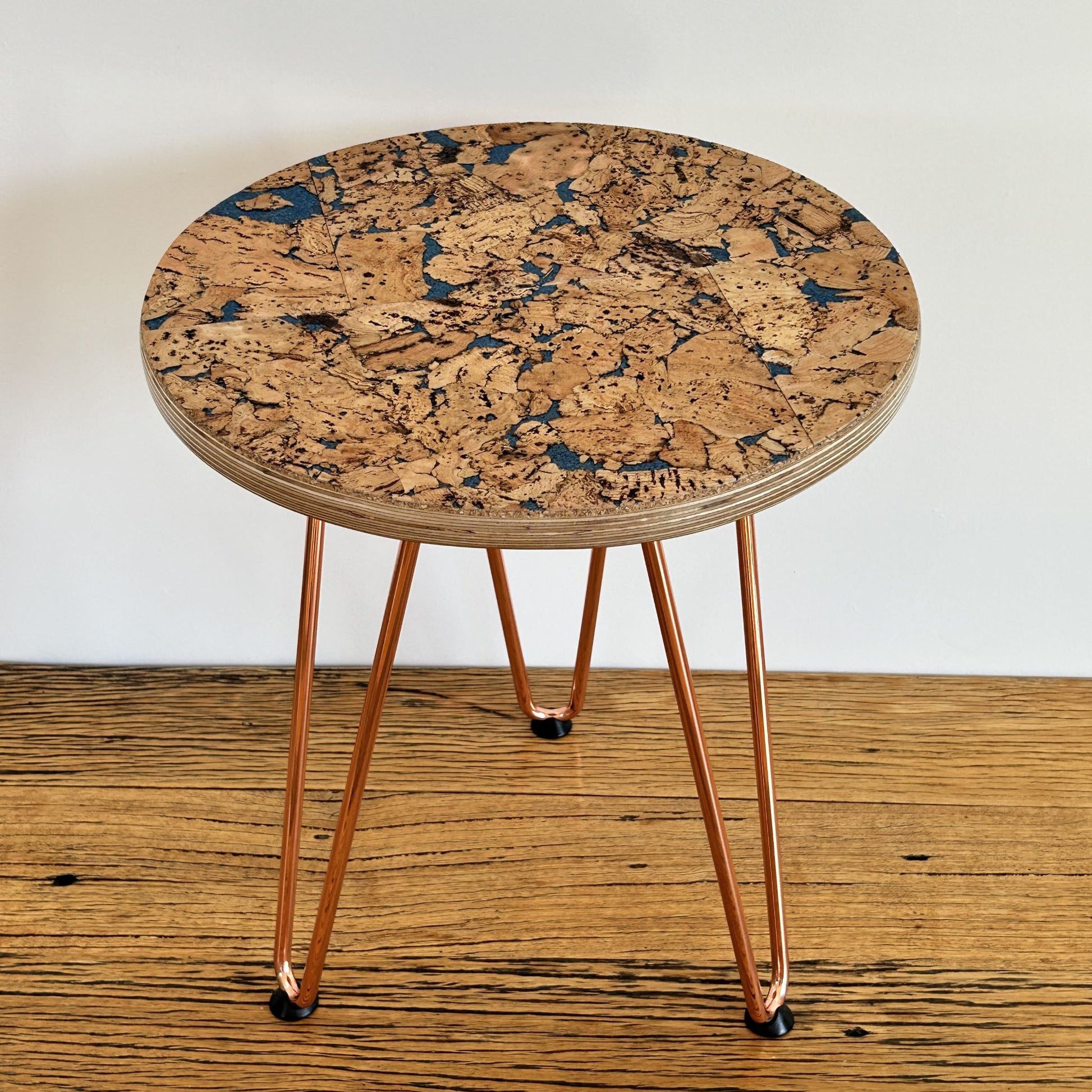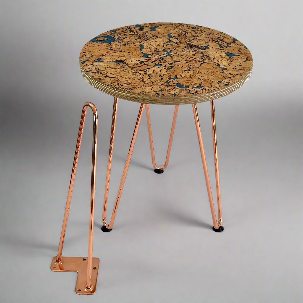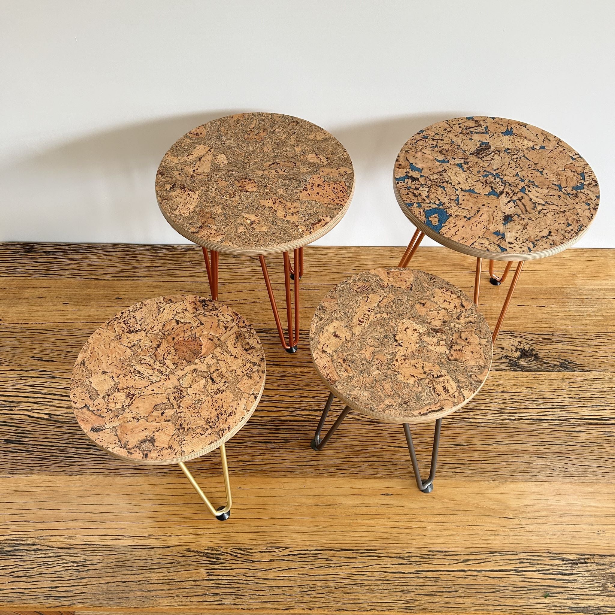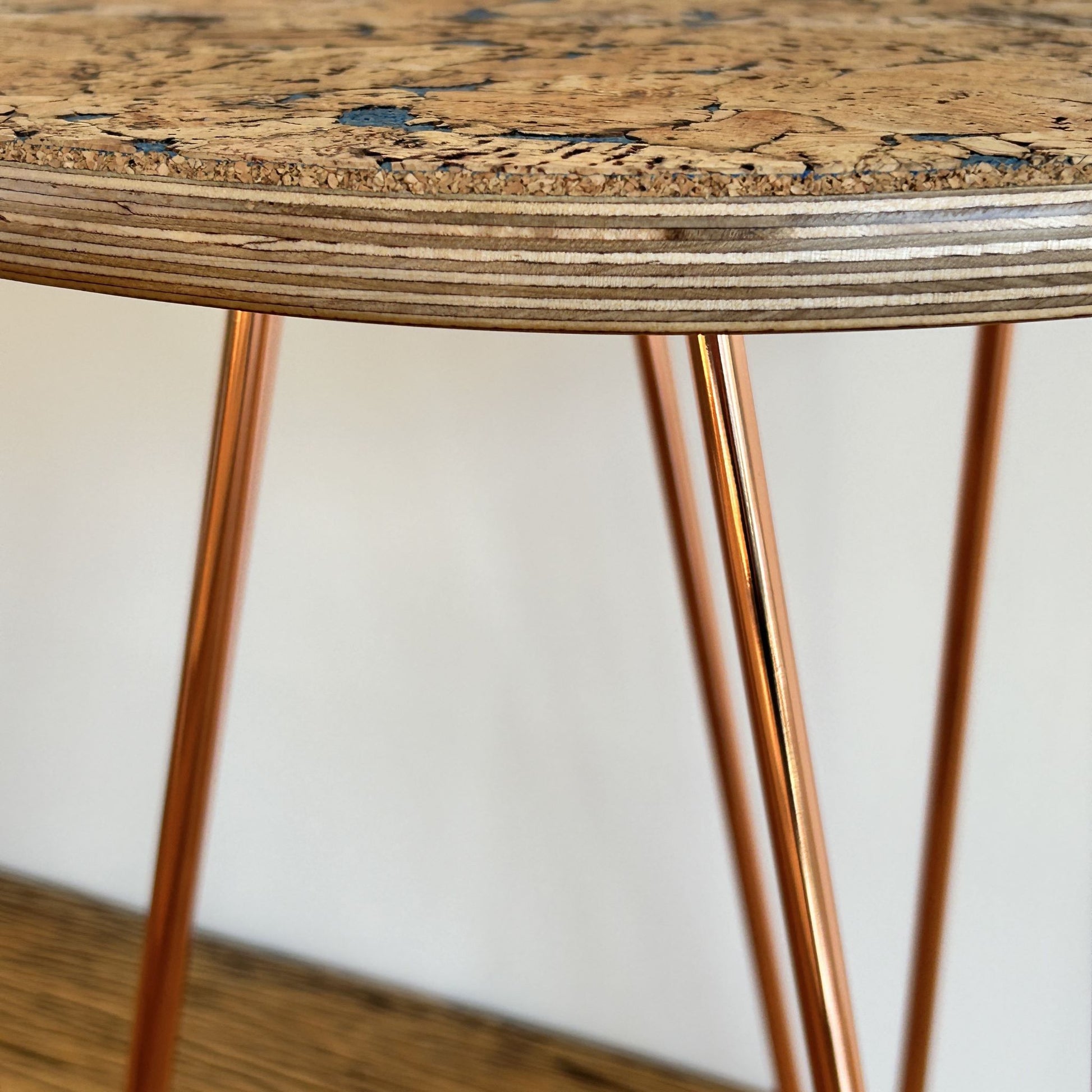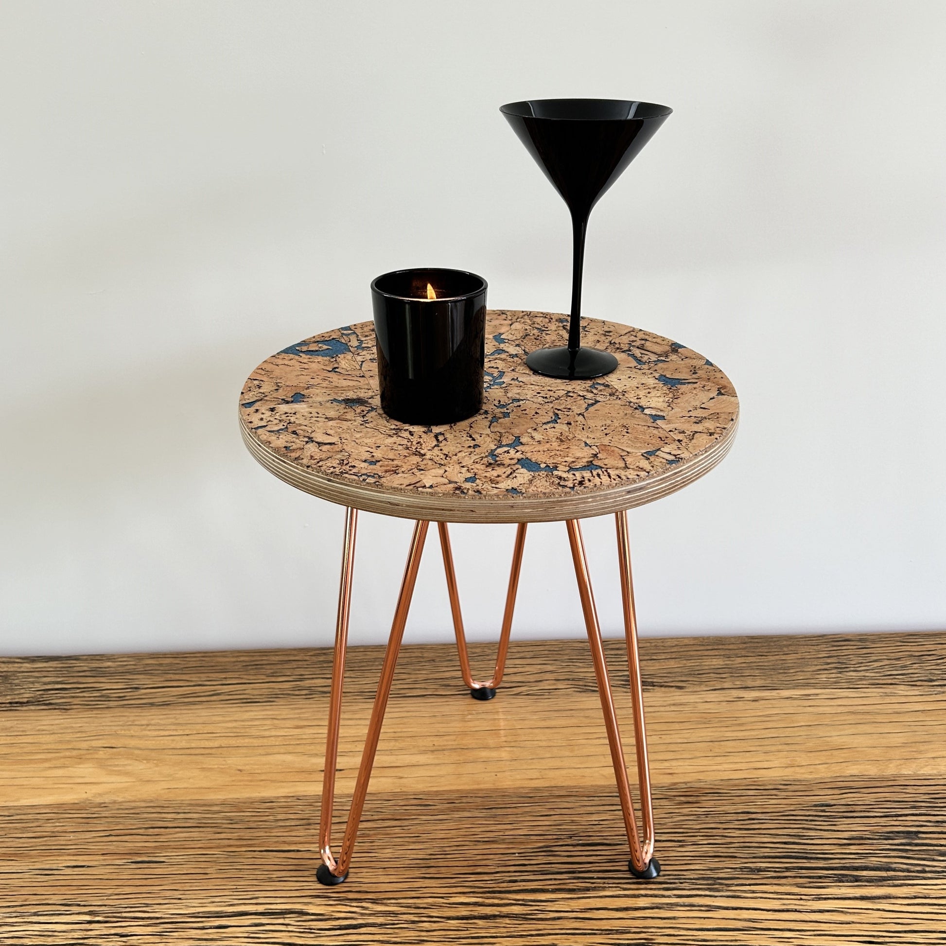 Our Classic Side Table combines old school elegance with mid-century glamour. They feature beautiful cork tops elegantly applied to stylish oiled birch plywood discs. These can be mounted on either steel hairpin legs, treated with a rust-proof protective clear coating, or electro-plated with a luxurious real copper or satin brass finish. They bring a note of luxury to any room. At the perfect height for your sofa, they serve as ideal mobile drink perches while you relax.